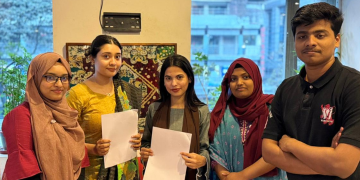 Representatives from DU Writers’ Hub present at the meeting included Nafisa Nur Hoque, President; Morioum Islam Shawly, General Secretary and Sadiha Afrose Shubhrata, Additional Head of Editing. On behalf of School of Entrepreneurship Development Kazi Hafsa Jahan, Head of External & Corporate Affairs; Project Coordinaotor Mahir Ahmed Hamza and Mahbub Rahman, Cofounder of CGIE and SED were present.